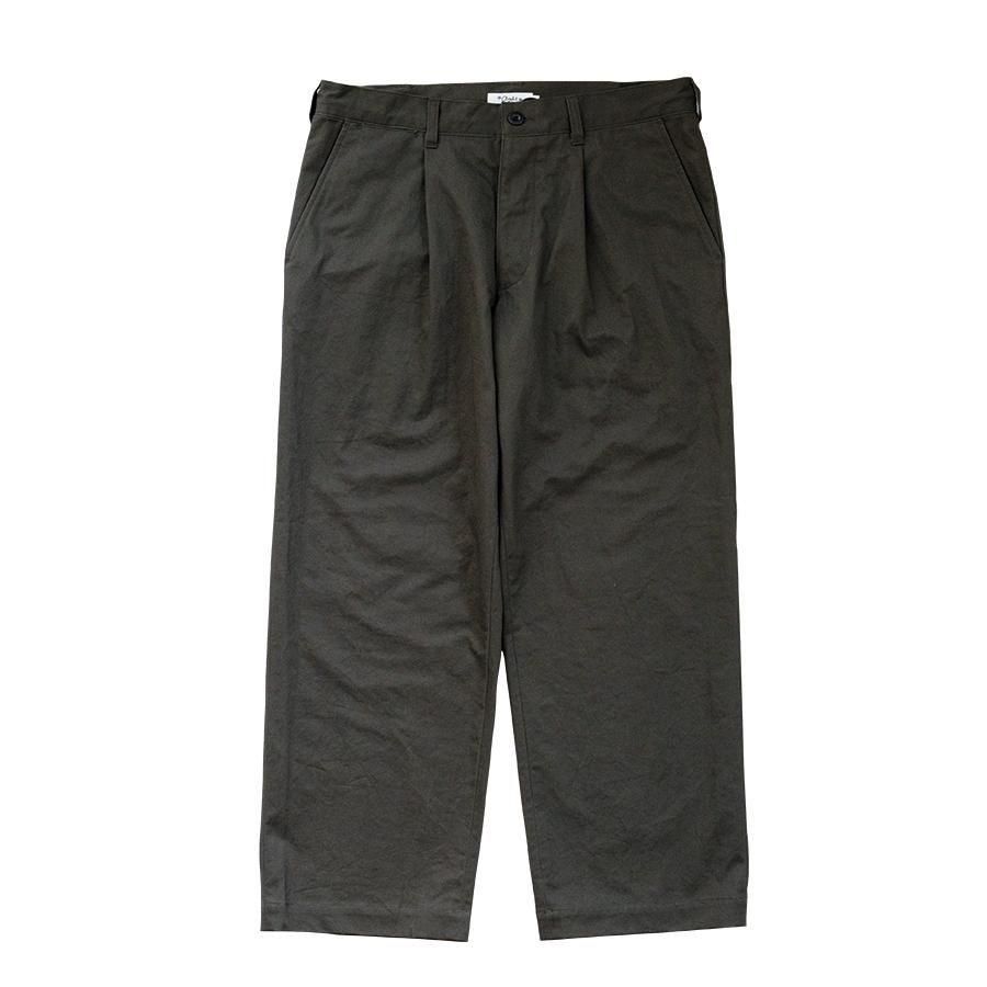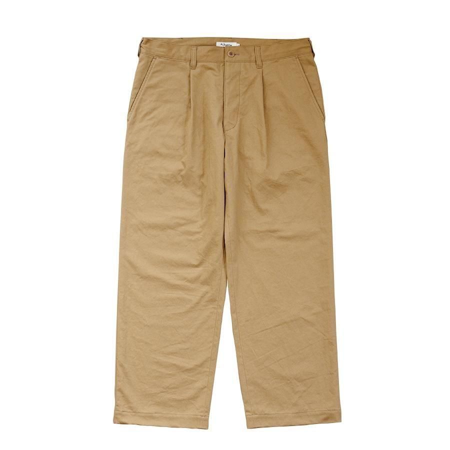 ワンタックでワタリから裾にかけてゆったりと程よくワイド目なシルエットのチノトラウザーズです。